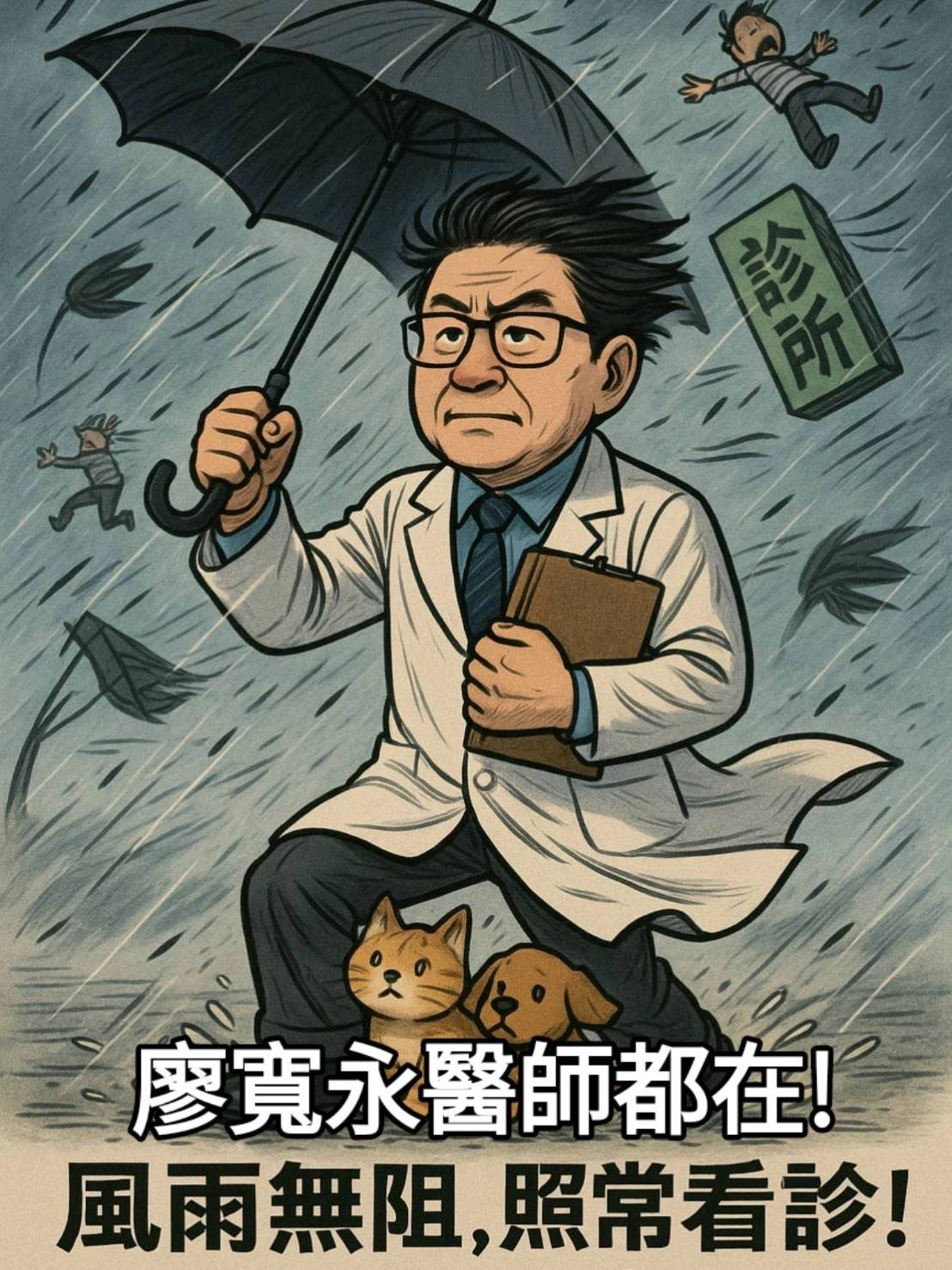 廖醫師依然腳踩風浪、手撐雨傘、一手夾行李📝穩穩走進診所!